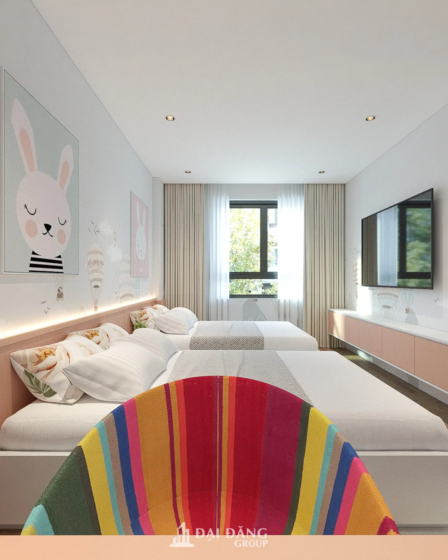 Việc thiết lập một môi trường sống hoàn hảo cho trẻ nhỏ chưa bao giờ là bài toán đơn giản. Nó đòi hỏi đơn vị thi công phải thấu hiểu tâm lý trẻ thơ đồng thời sở hữu kỹ thuật xử lý không gian điêu luyện. Bằng năng lực biên soạn không gian hiện đại và tư duy nội hóa chuyên sâu, Đại Đăng Group đã biến phòng ngủ đôi tại dự án này thành một “vương quốc” mộng mơ, nơi mỗi đứa trẻ đều được tự do phát triển cá tính.