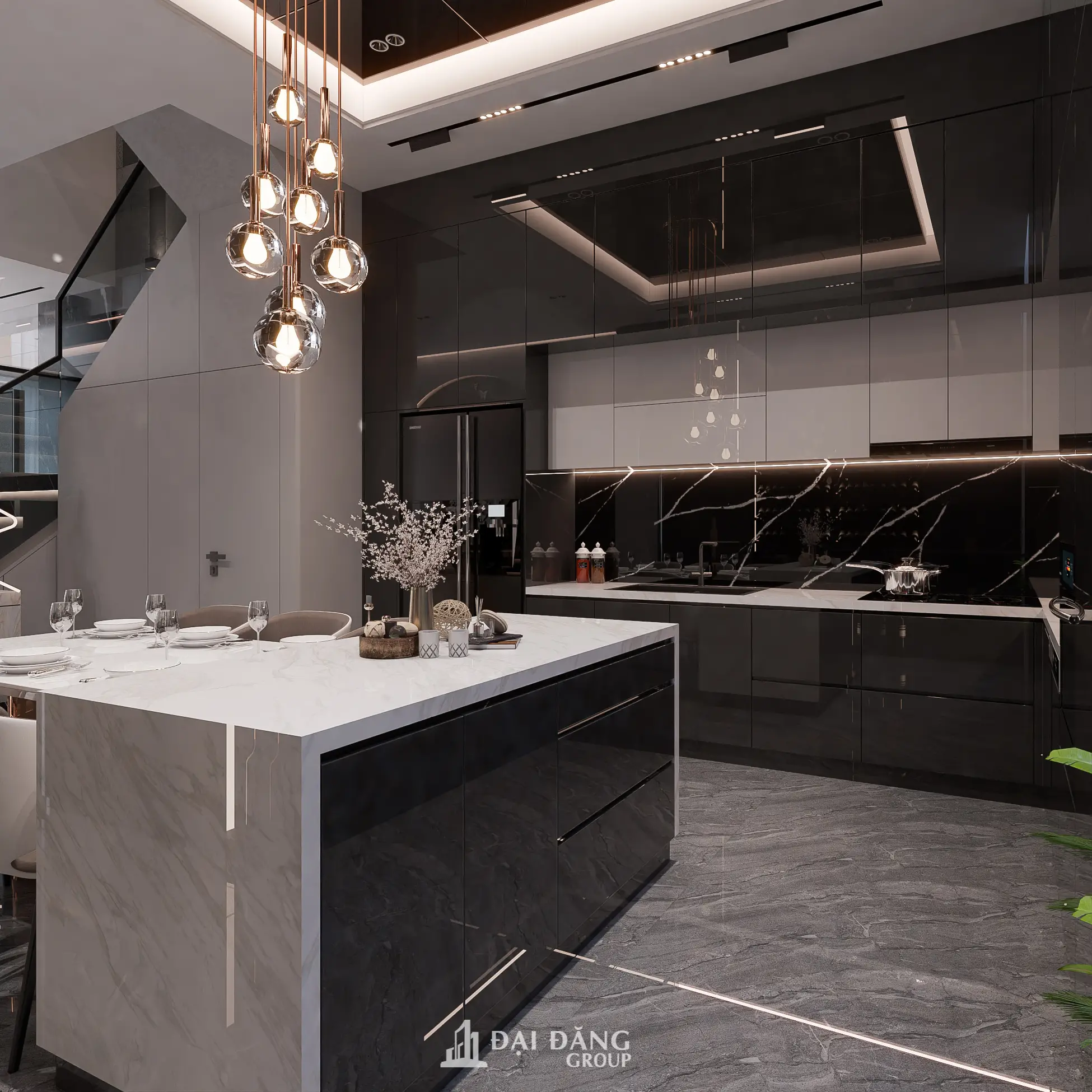 Sự đối lập giữa đảo bếp mặt đá trắng vân mây và hệ tủ bếp Acrylic bóng gương màu đen tạo nên một nhịp điệu thị giác thú vị. Chất liệu Acrylic không chỉ dễ dàng vệ sinh mà còn phản chiếu ánh sáng, giúp khu vực nấu nướng luôn giữ được vẻ hiện đại, sạch sẽ và thoáng đãng tuyệt đối.