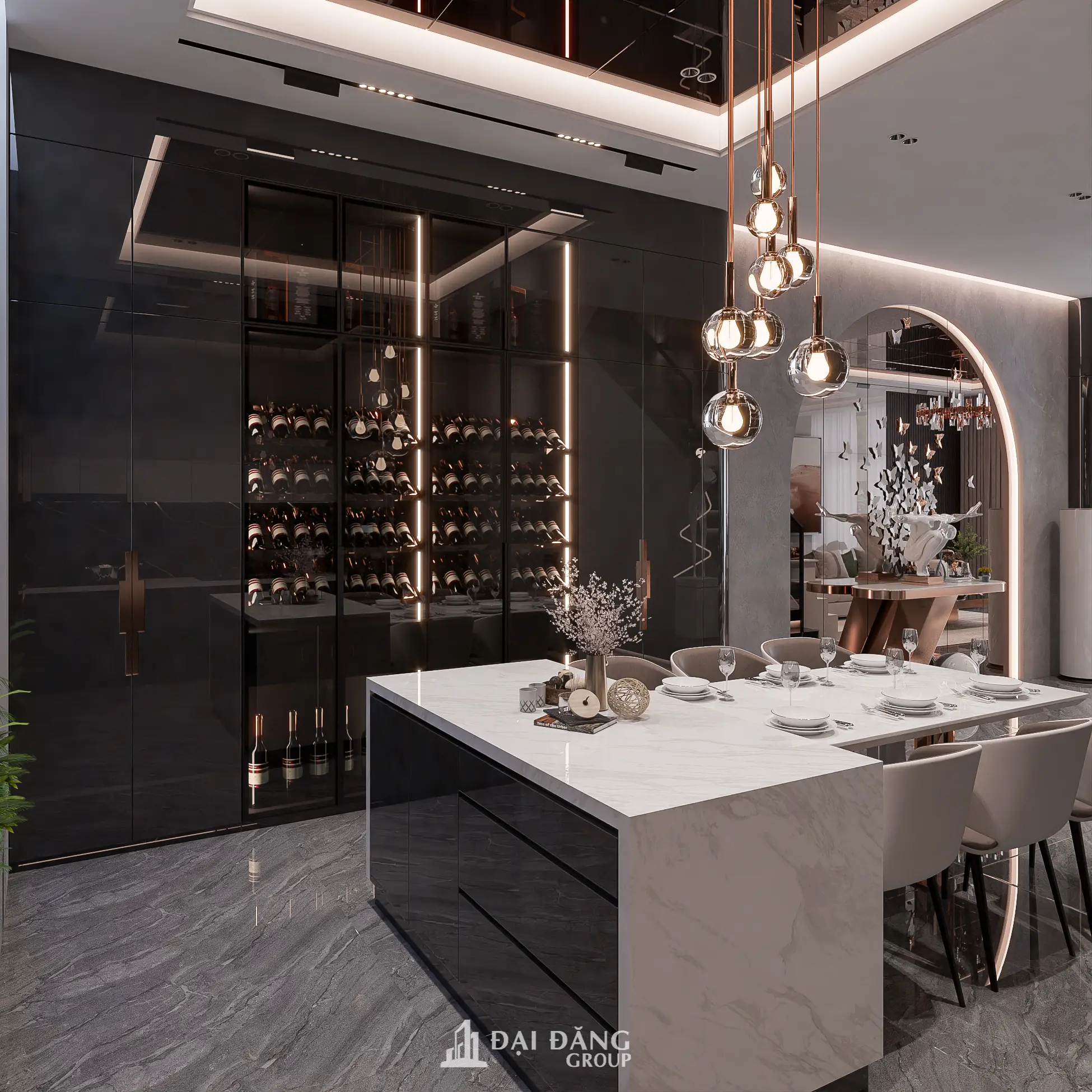 Khu vực bếp trong bản thiết kế biệt thự 01 được ví như một lounge hạng sang. Tâm điểm là hệ tủ rượu cánh kính Panorama kịch trần, kết hợp hoàn hảo với hệ thống đèn LED âm tủ. Đây không chỉ là nơi lưu trữ những chai vang quý giá mà còn là món đồ nội thất trang trí đắt giá cho những buổi tiệc tối sang trọng.