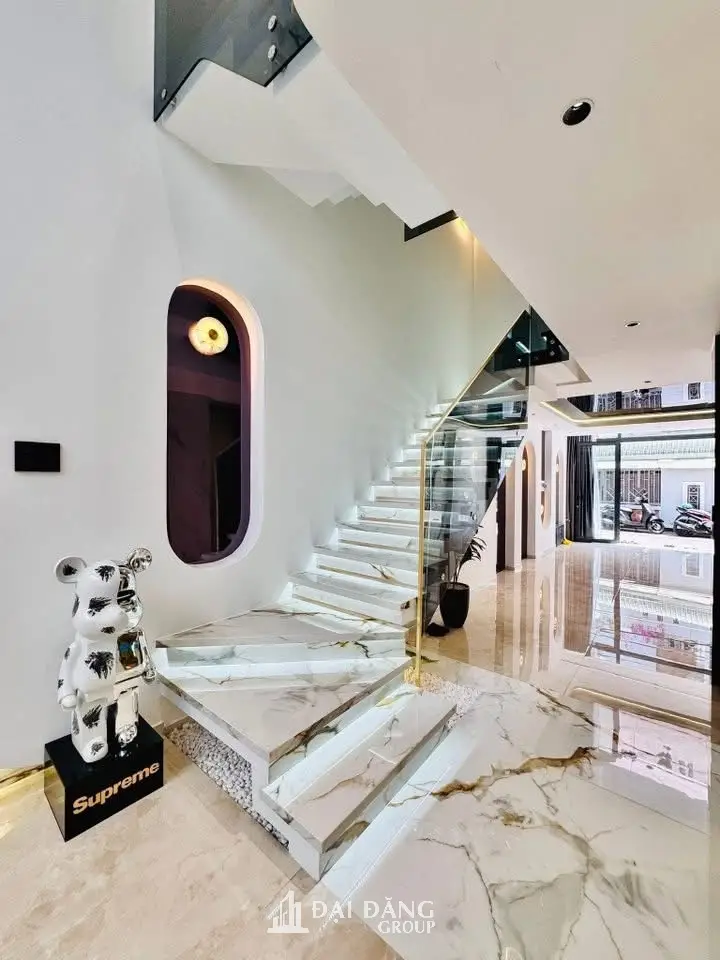 Điểm đắt giá nhất trong quy trình nội hóa không gian này chính là hệ cầu thang. Đại Đăng Group đã thực hiện việc tác chế thực thể bằng đá marble vân mây kết hợp đèn LED xuyên sáng từng bậc. Sự kết hợp giữa lan can kính cường lực không tay vịn tạo nên cảm giác bay bổng, mở rộng tối đa tầm nhìn và xóa nhòa ranh giới giữa các tầng trong tòa nhà.