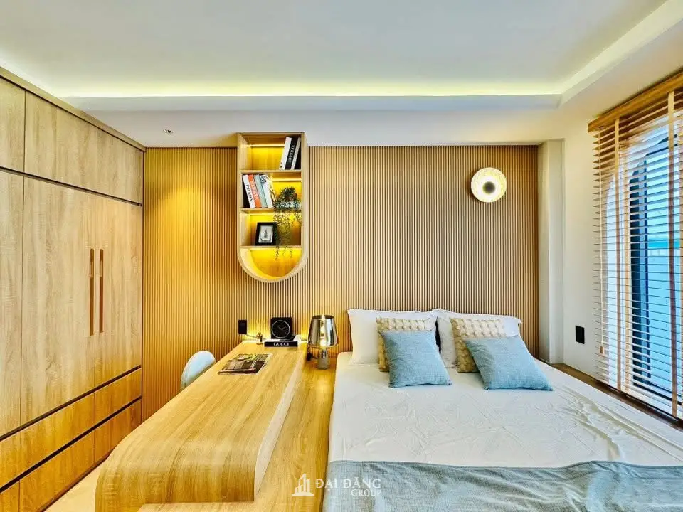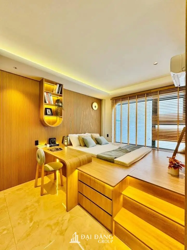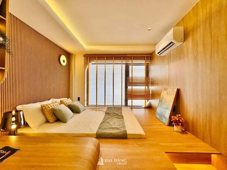 Phòng ngủ là nơi sự riêng tư được đặt lên hàng đầu. Chúng tôi áp dụng giải pháp may đo thực tế với giường ngủ dạng bục (platform bed) tích hợp ngăn kéo thông minh. Toàn bộ vách đầu giường ốp gỗ lam sóng kết hợp ánh sáng vàng dịu nhẹ, mang lại cảm giác ấm cúng và an yên tuyệt đối cho gia chủ sau một ngày làm việc dài đầy mệt mỏi.