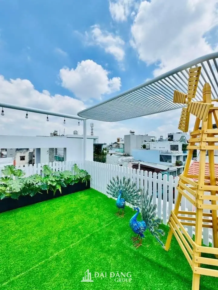 Không gian tầng thượng được chúng tôi nội hóa thành một khu vườn nghỉ dưỡng thu nhỏ. Với thảm cỏ xanh mướt, hệ lan can trắng tinh khôi và những tiểu cảnh trang trí mộc mạc như cối xay gió gỗ điểm thêm hai chú công xinh xắn đứng trên thảm cỏ, đây chính là nơi gia chủ có thể tận hưởng không khí trong lành và nhìn ngắm thành phố từ trên cao.