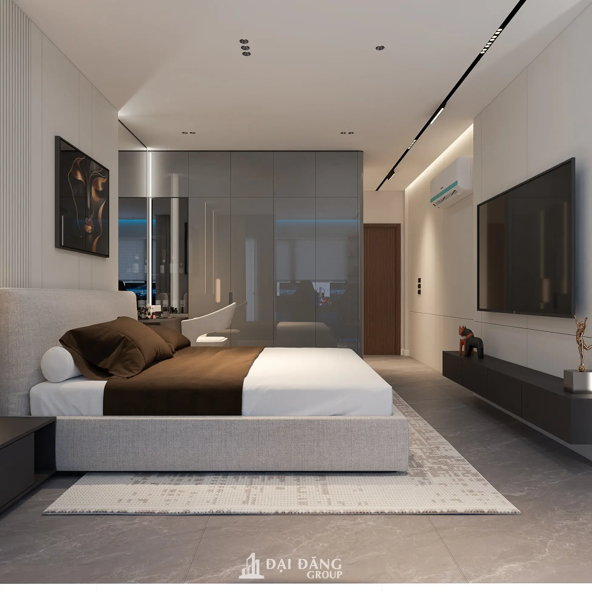 Dự án bao gồm 3 phòng ngủ được thiết kế đồng bộ. Trong đó, phòng ngủ Master được ưu tiên vách đầu giường bọc nỉ da, tích hợp bàn làm việc nhỏ gọn. Hệ tủ quần áo kịch trần giúp gia chủ thoải mái lưu trữ đồ đạc mà không làm căn phòng trở nên chật chội.