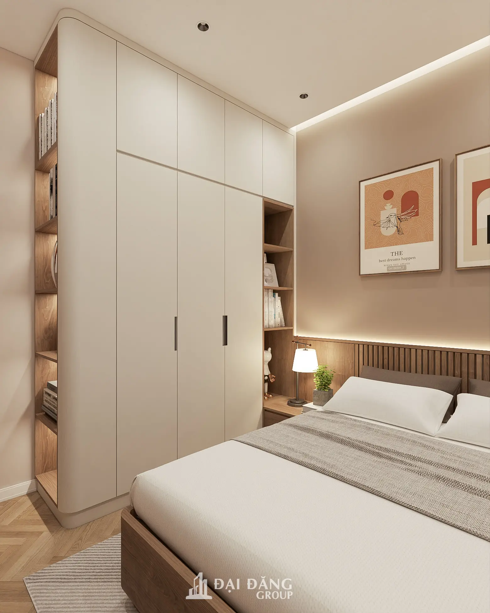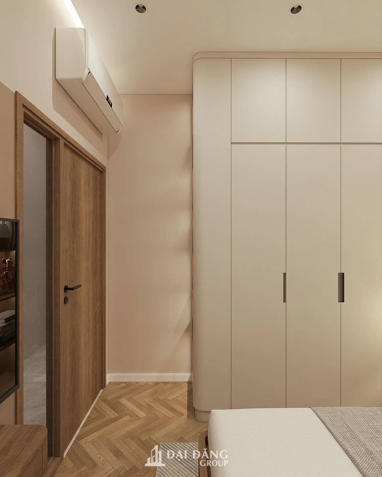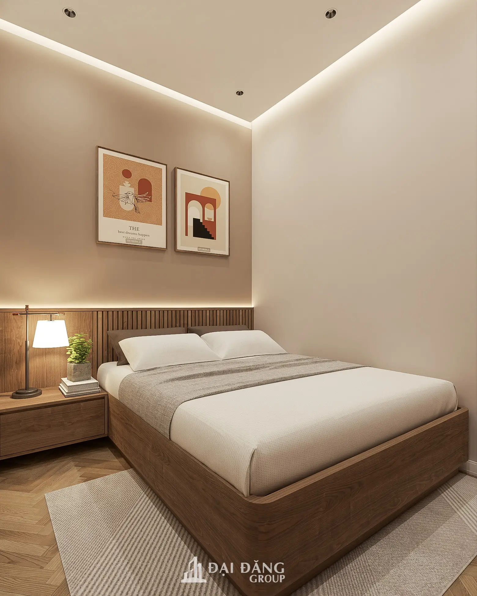 Phòng ngủ Master: Sử dụng vách ốp gỗ phẳng kết hợp đèn LED hắt tạo chiều sâu. Hệ tủ quần áo cánh kính lùa màu khói giúp không gian trở nên cực kỳ đẳng cấp.