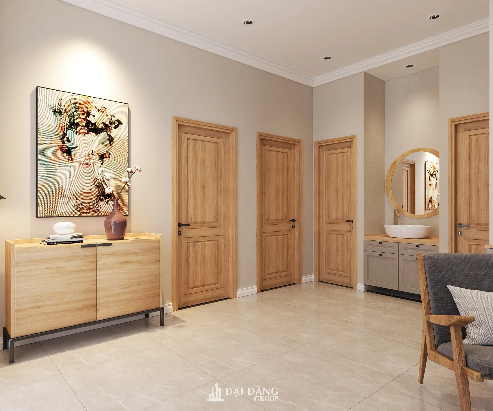 Bảng màu trung tính như kem, beige và xám ghi được sử dụng làm nền chủ đạo. Điểm nhấn nằm ở các chi tiết gỗ sồi ấm áp và đá vân mây sang trọng. Đây chính là công thức hoàn hảo để tạo nên một thiết kế nội thất phong cách hiện đại tối giản nhưng vẫn đầy đủ sự ấm cúng cho gia đình.