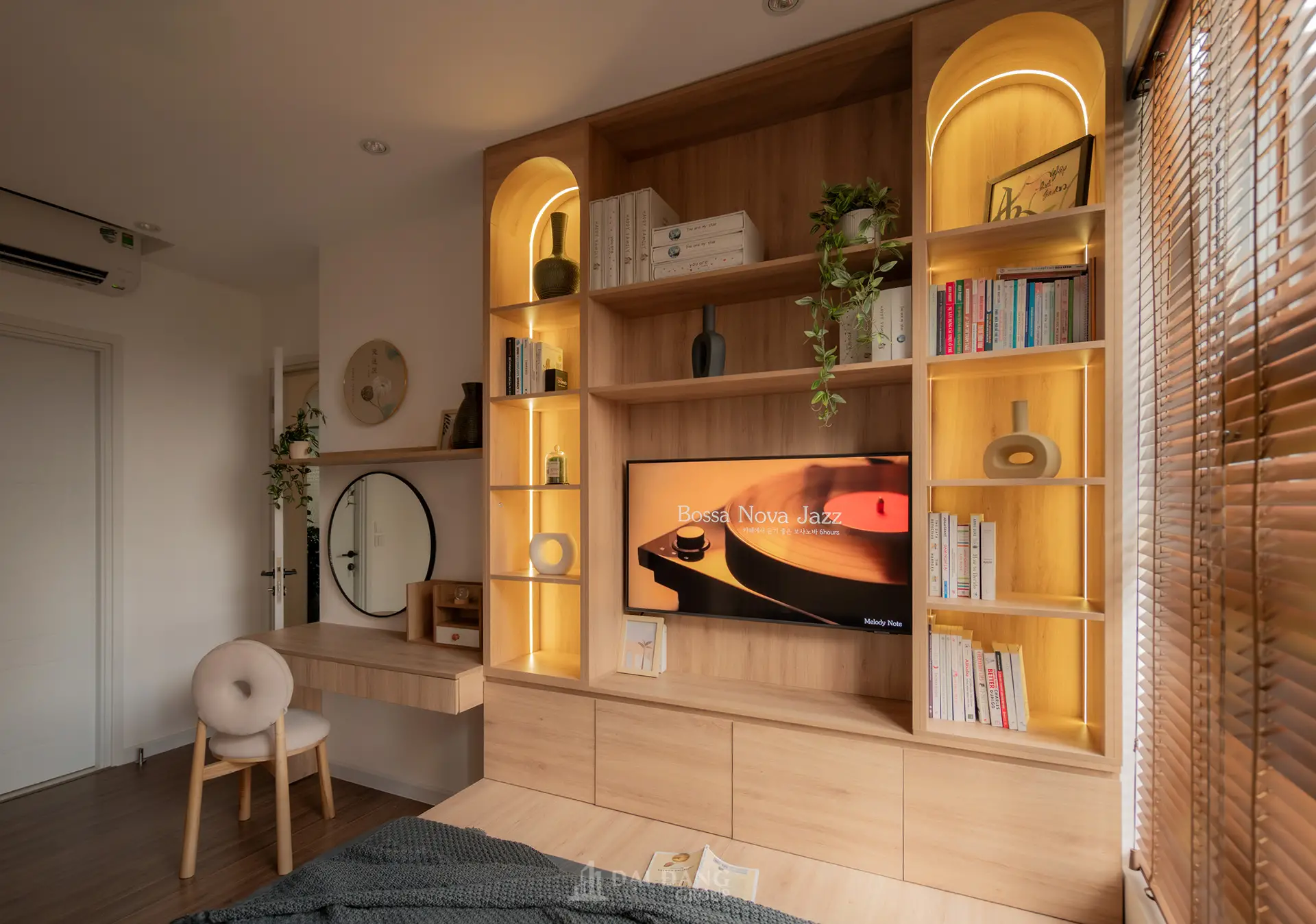 Bàn trang điểm nhỏ gọn với gương tròn led là điểm nhấn điệu đà cho căn phòng. Đây là thiết kế rất được các quý cô tại Chung cư Celesta Rise ưa chuộng vì sự tiện dụng và tính thẩm mỹ cao.
