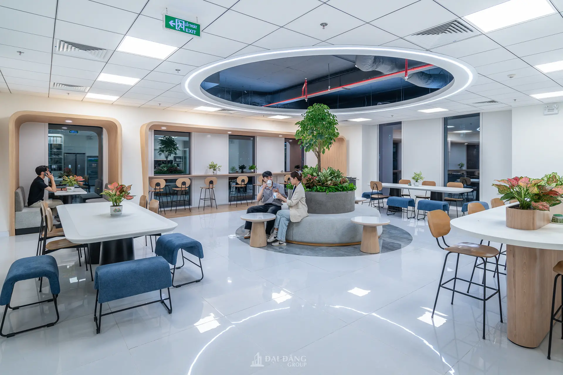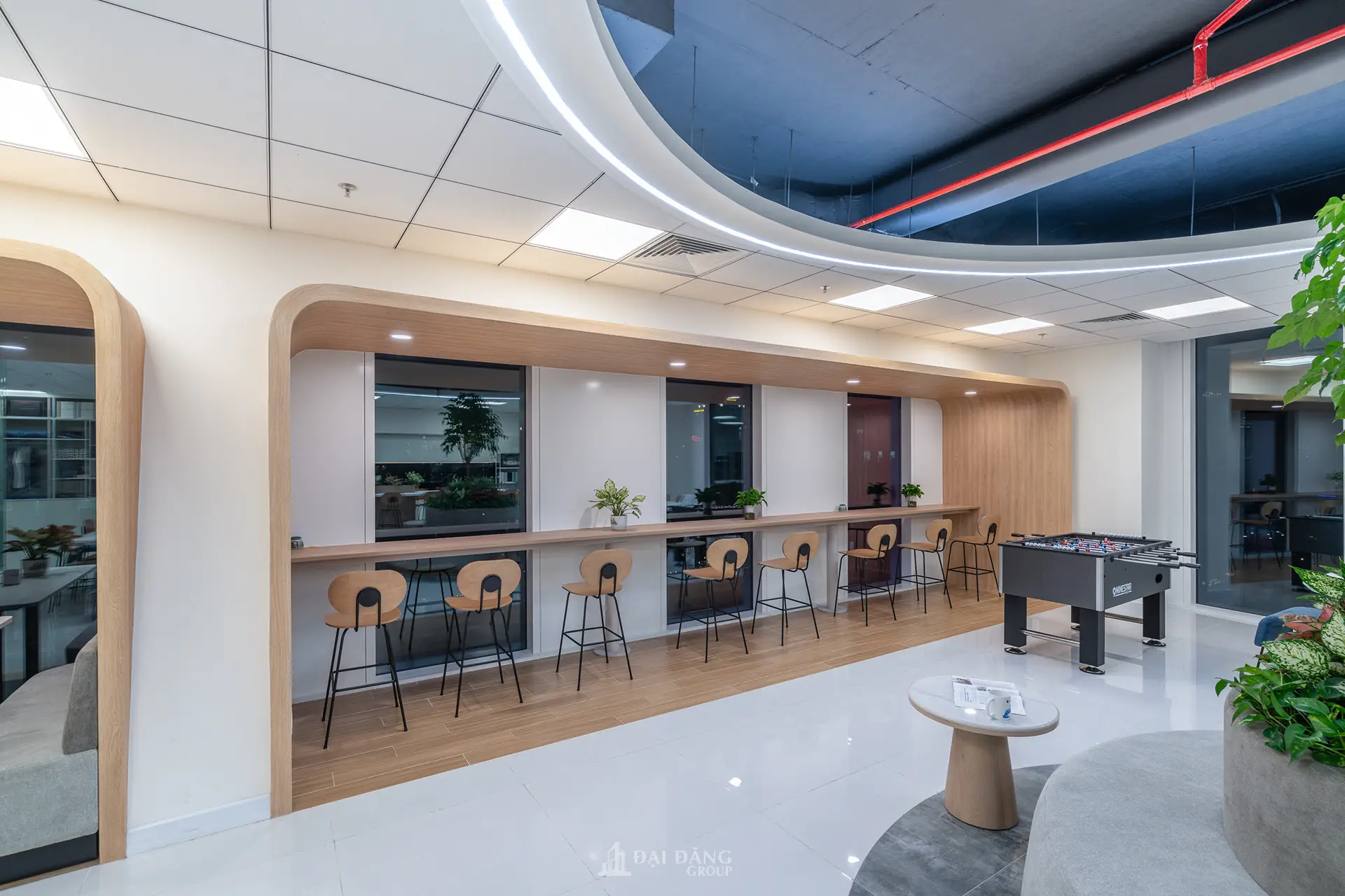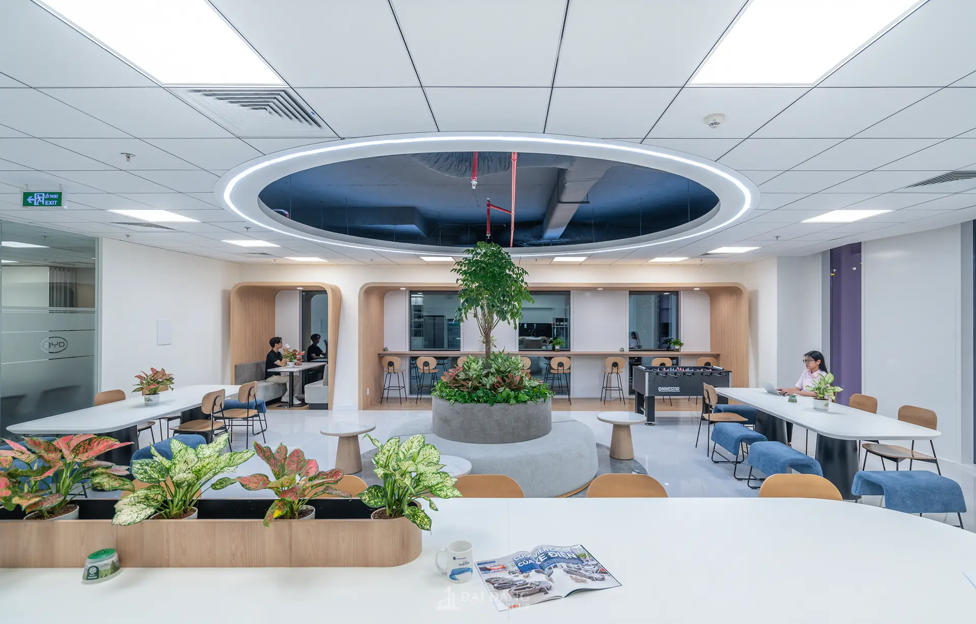 Ánh sáng và mảng xanh: Hệ thống chiếu sáng được bố trí khoa học, kết hợp giữa ánh sáng tự nhiên và đèn LED âm trần có chỉ số hoàn màu cao, giúp giảm mỏi mắt và tăng khả năng tập trung. Các mảng xanh nội thất được lồng ghép khéo léo để cân bằng lại sự khô cứng của máy móc, tạo nên một “văn phòng xanh” đúng nghĩa.