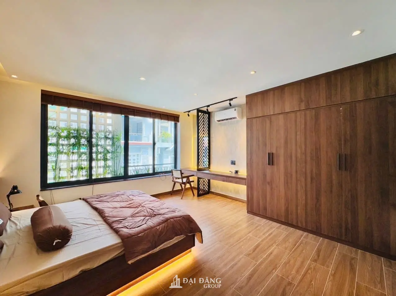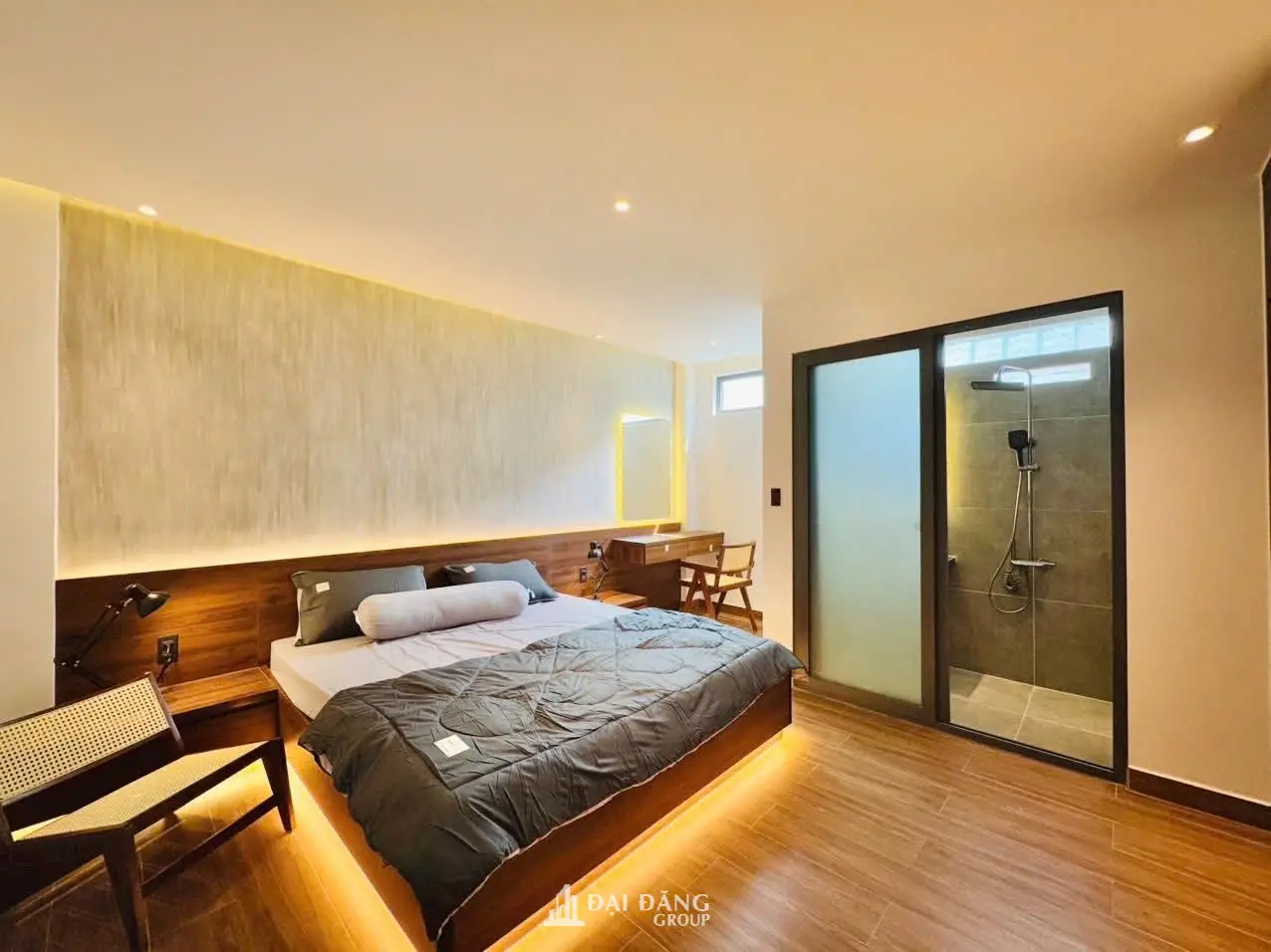Ánh sáng: Hệ đèn hắt khe đầu giường và đèn thả nghệ thuật tạo nên kịch bản ánh sáng dịu mắt, hỗ trợ giấc ngủ ngon.