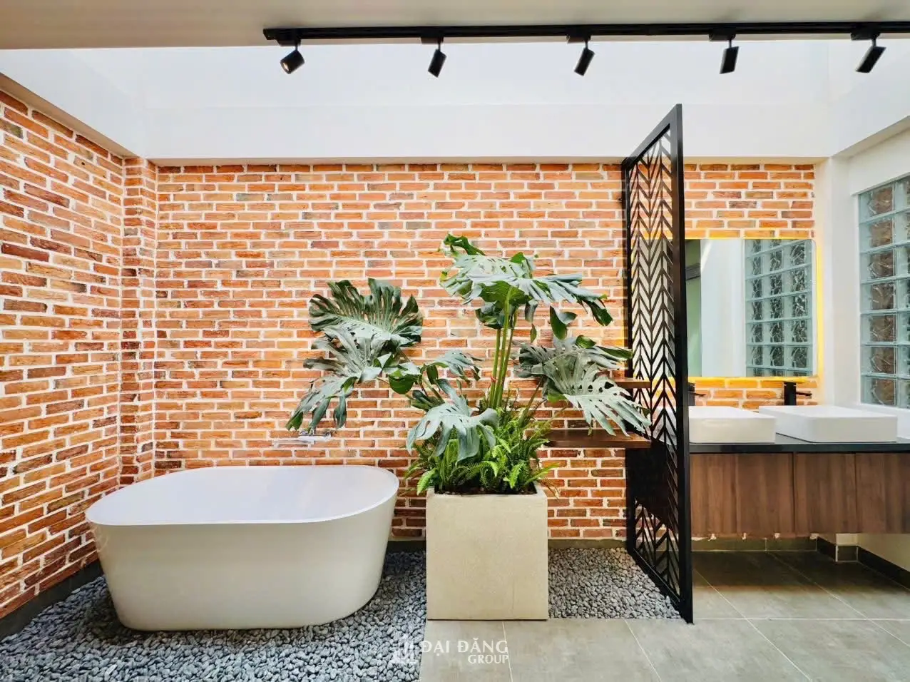 Đây là không gian đắt giá nhất của công trình. Vượt xa khỏi định nghĩa về một phòng tắm thông thường, Đại Đăng Group đã thiết kế bồn tắm nằm đặt giữa không gian lộ thiên với sàn rải sỏi và cây xanh. Sự kết hợp giữa tường gạch trần đỏ, bồn tắm trắng tinh khôi và cây xanh tạo nên một “nghi thức” Wellness thực sự cho gia chủ, khẳng định đẳng cấp thiết kế nội thất nhà phố hiện đại của Đại Đăng Group.