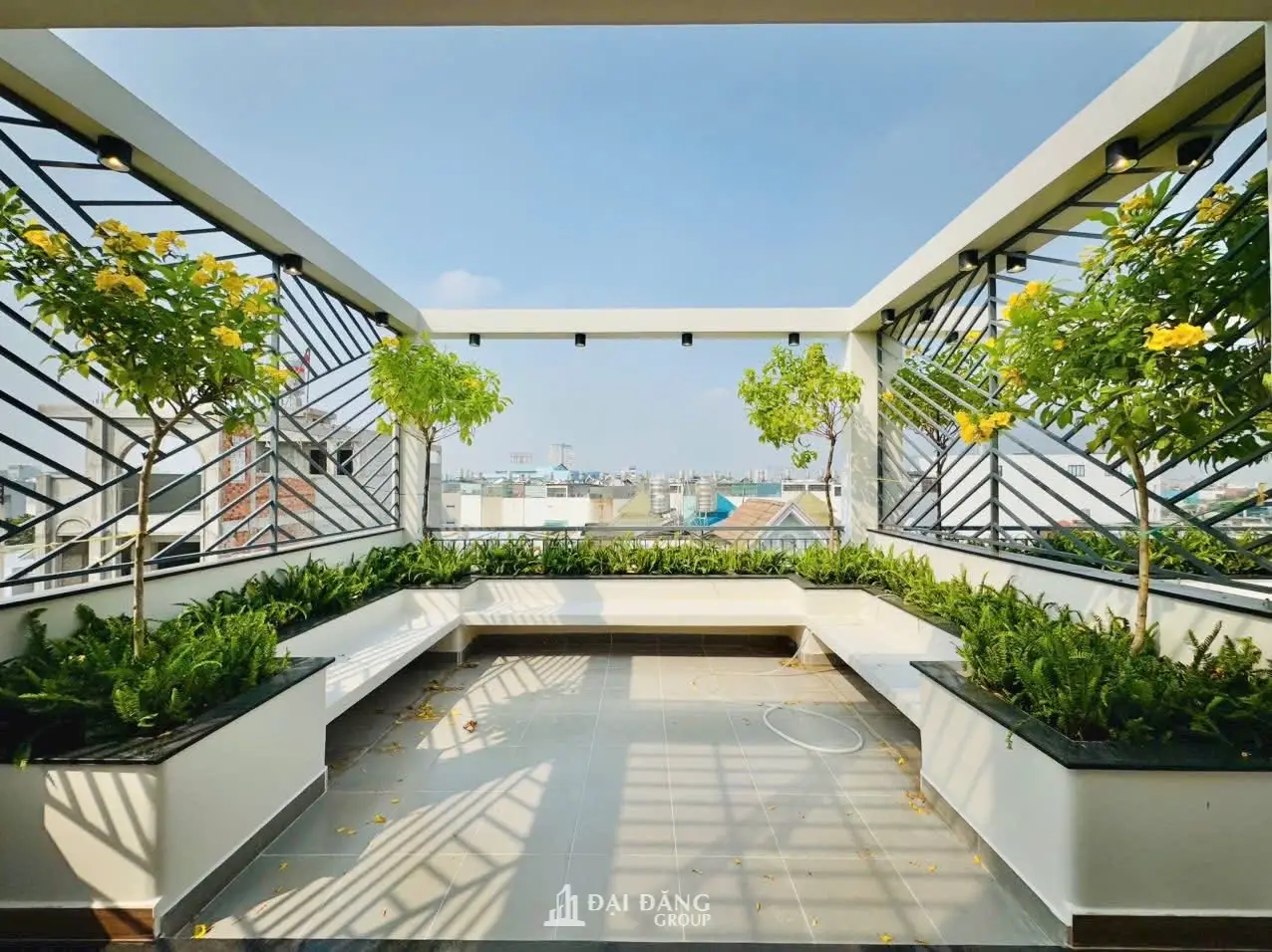 Sân thượng của căn nhà phố Quận 2 được biến hóa thành một khu vườn Zen thu nhỏ. Chúng tôi bố trí các bệ ngồi bằng bê tông mài, kết hợp với các dải cây xanh và gạch bông gió trang trí. Đây là nơi lý tưởng để gia chủ tập Yoga, thiền định hoặc đơn giản là ngồi thưởng trà và ngắm nhìn cảnh quan sông Sài Gòn từ trên cao, một điểm nhấn hoàn hảo cho một bản thiết kế nội thất nhà phố hiện đại chuẩn Wellness.